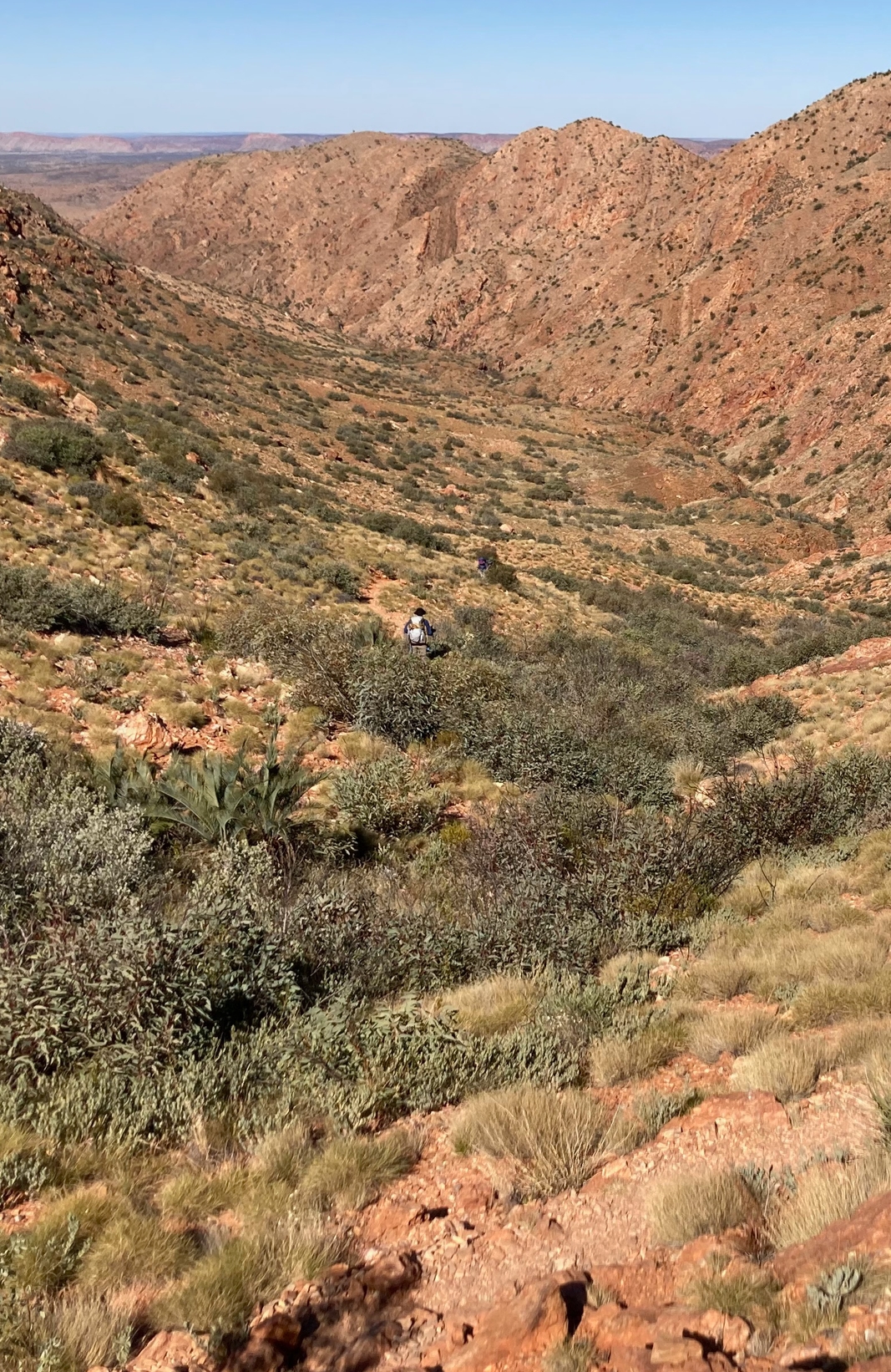 In a very short period of time the silhouette of a solitary hiker appeared on the ridge line above us. Our eyes got wide when we saw that the bloke was wearing short pants. It was way too cold to have any exposed skin. It turned out that this was one of the mythical creatures who traverse the trail in 7 days or less. He had spent the night in the relative warmth of Millers Flat having come from Hugh Gorge the day before. Getting up at 5am he had eschewed the easier low path to Tangentyere Junction and scrambled up the steep western route (Mesic Gully) to Loretta's Lookout so that he could catch the sunrise. Mad. He had completed 6 days of his hike and planned to finish the trail that day. That was if he could get accommodation in Alice. Otherwise he would stop at Wallaby Gap and amble into town tomorrow - just in time for his flight out. We dubbed him the "Road Runner" and he would feature often in our discussions about distances, times, gear, and logistics in the days to come.