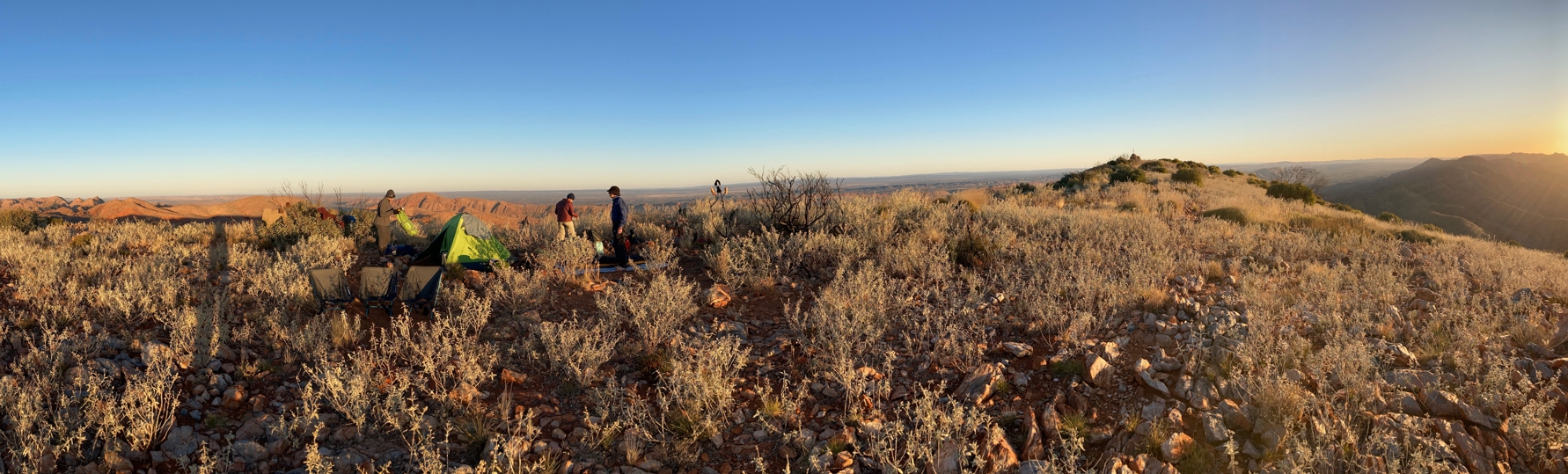 It took another hour and a half to carefully negotiate the remaining 4.5km (200m ascent) of rocky ridgeline. In absolute terms we had ascended over 400m since lunch. Our packs were at their heaviest, with extra water for the dry camp site, and several days of food. Everything hurt. Fraser and I had pushed on and were a few hundred meters ahead of Elise and Phil when we arrived at Brinkley Bluff (5:10pm). We scouted up to the western end of the Bluff for camp sites, trying to find something a little sheltered. Unfortunately it seemed that the best sites were already taken. We settled for an exposed location back at the eastern end of the bluff, but with some small rock walls for wind protection.
