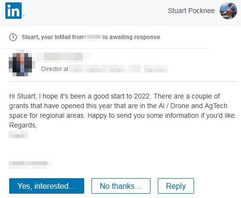 Hi Stuart, I hope it's been a good start to 2022. There are a couple of grants that have opened this year that are in the AI / Drone and AgTech space for regional areas. You can read more about them at: