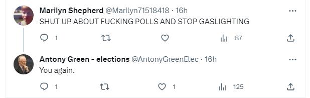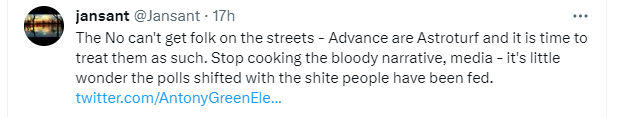 TL;DR: Antony Green posted a tweet pointing out the logical fallacy certain poll deniers were making, got hammered by "Yes" supporters, then deleted the tweet. 🤔 Interesting times.