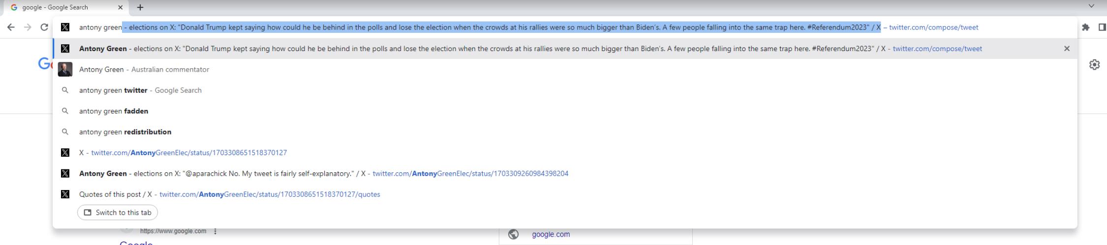 However, because I had tried replying to his tweet (as a quote tweet), the entire text of his tweet ended up in my browser's location bar predictive history cache. You can see this below (click to expand).