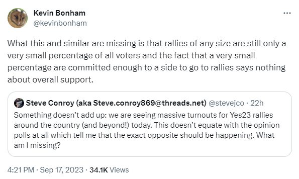 ❝Donald Trump kept saying how could he be behind in the polls and lose the election when the crowds at his rallies were so much bigger than Biden's. A few people falling into the same trap here. #Referendum2023❞