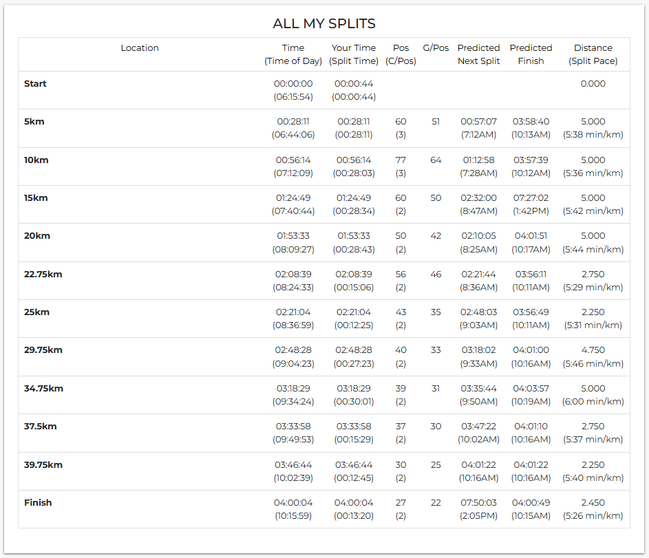 In the end I ran a time of 4:00:04. I wanted to be just under 4hr. Going over is a bit of a pacing faux pas. I slowed up in the last 200m in an effort to help one more runner home under 4hrs. Unfortunately, that only meant both of us were a fraction over. 😔